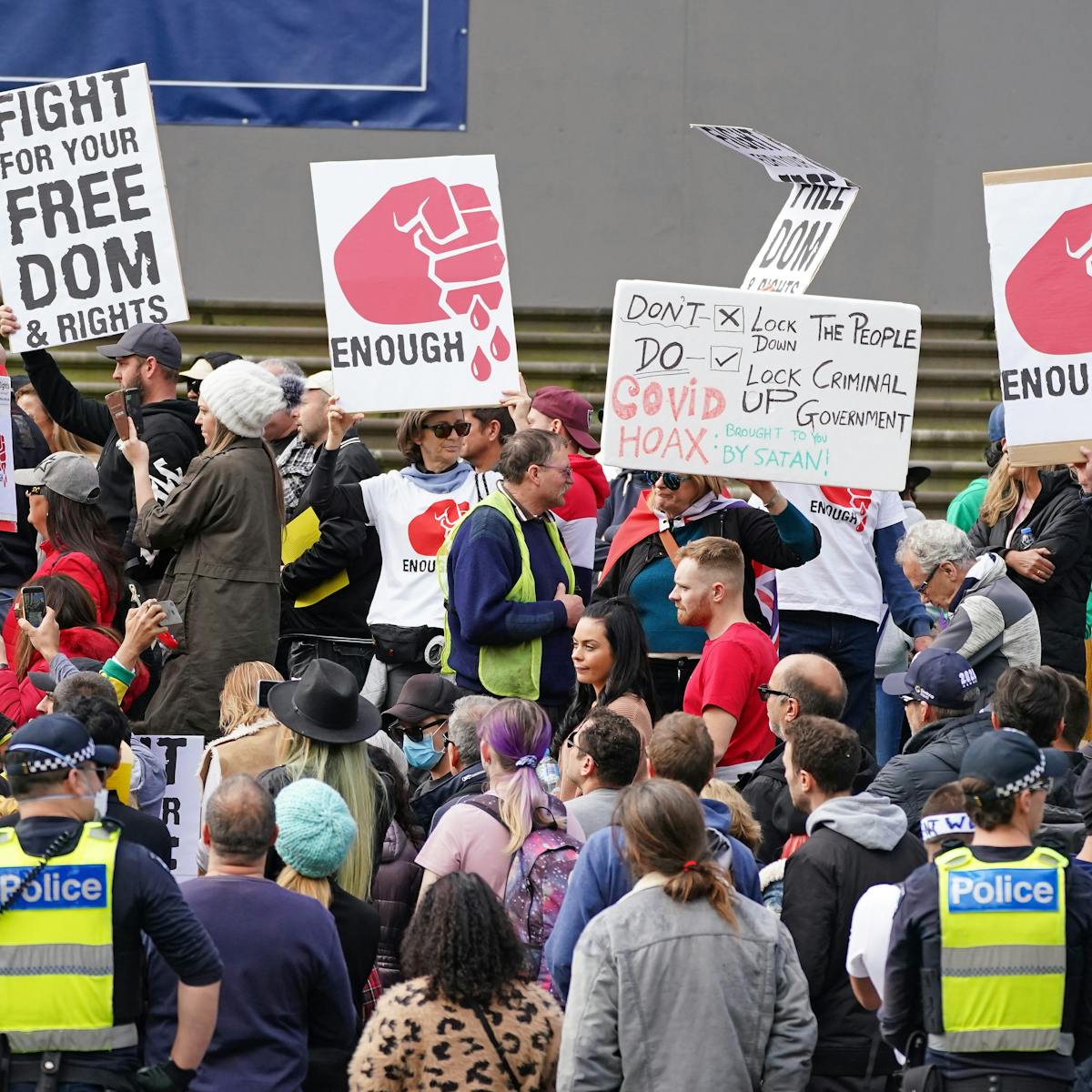 Police have tackled a number of men to the ground and arrested 14 people after an anti-lockdown and vaccination protest near Melbournes CBD attracted 150 people then turned violent on. The strict measures also this weekend sparked anti-restriction rallies. Victorias latest COVID-19 lockdown has sparked protest as well as a record number of vaccinations.