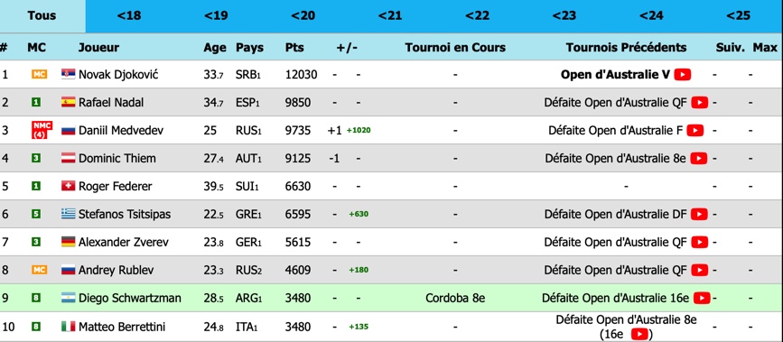En cas de victoire dans le tournoi Catégories de. Classement Mondial ATP. Posted by mas September 13 2021 Leave a comment on Tennis ATP Classement Rafael Nadal sort du Top 5 au classement ATP.